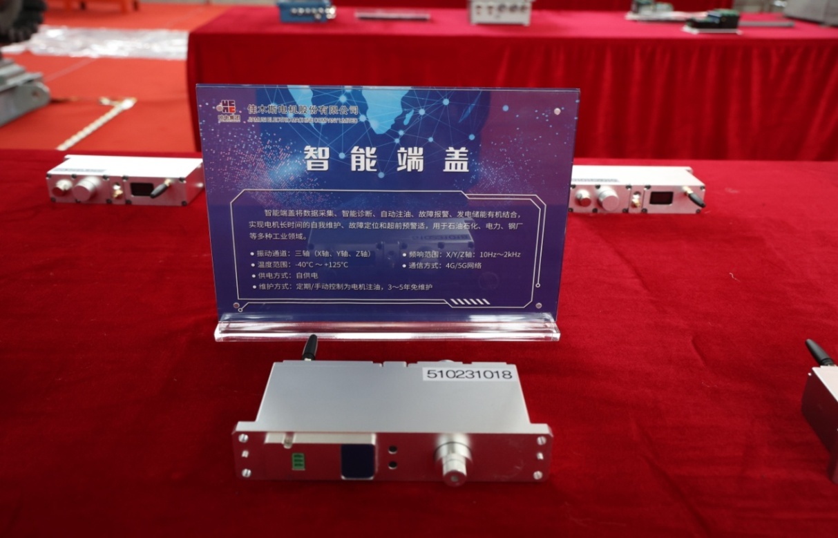 此次發(fā)布會展出的智能端蓋,端蓋內(nèi)置發(fā)電機,為邊緣智能終端供電,無需外接電源,解決續(xù)航問題,邊緣智能終端嵌入安裝端蓋中,實時采集振動、溫度數(shù)據(jù),數(shù)據(jù)采集更精準,對多種故障實現(xiàn)早期預(yù)警及智能診斷,該端蓋專為各類高、低壓電動機設(shè)計,適用于各類工業(yè)場景。