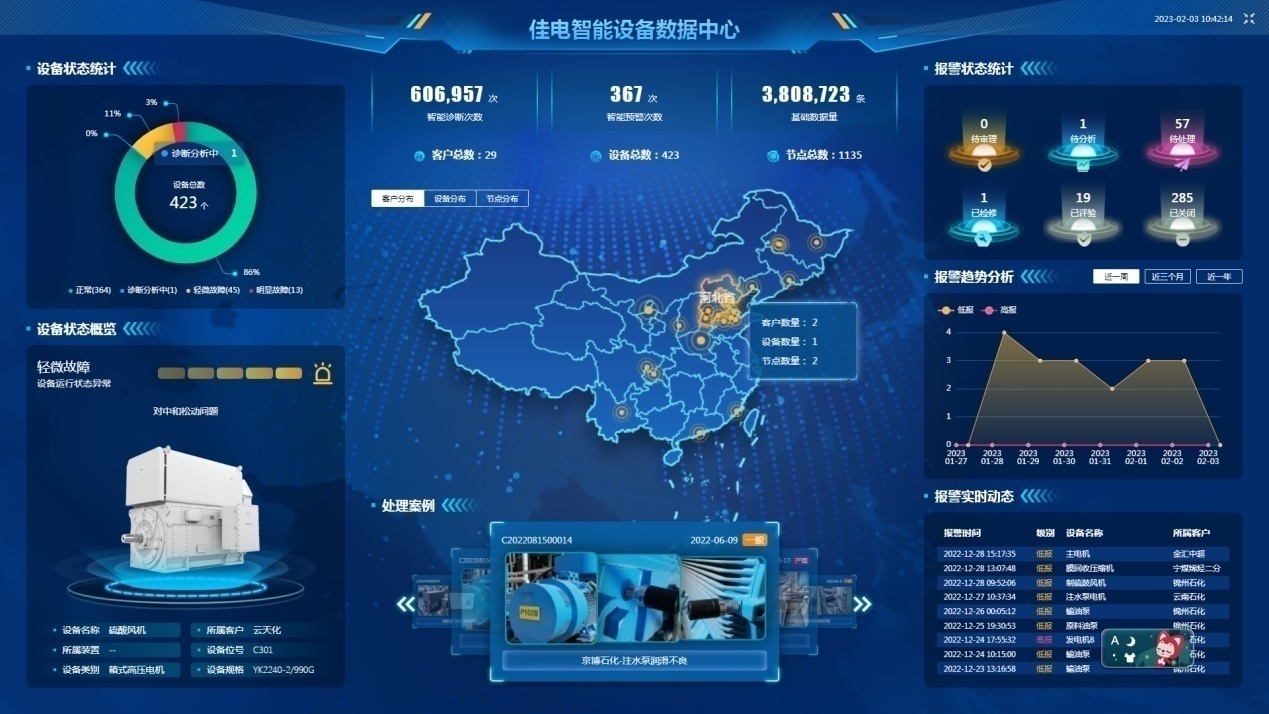 佳電股份形成了以6大系列智能高效異步電動機(即YE5、YBX5、YBX3、YJKK/YJKS、YXKK/YXKS、YBF)和1類永磁同步電動機為主的“6+1”智能高效電動機板塊,為電動機行業(yè)向高端化、智能化、綠色化轉(zhuǎn)型做出示范引領(lǐng)。佳電股份不僅是一家專業(yè)的先進電機產(chǎn)品制造商,也是工業(yè)設(shè)備智能運維整體解決方案的提供商。工業(yè)設(shè)備狀態(tài)監(jiān)測與故障診斷系統(tǒng)產(chǎn)品,通過對設(shè)備運行的物理參數(shù)進行采集、篩選、傳輸和數(shù)據(jù)分析,感知設(shè)備的運行故障及其變化趨勢,為設(shè)備運維管理決策提供數(shù)據(jù)支撐,實現(xiàn)工業(yè)設(shè)備的預(yù)測性維護,提高生產(chǎn)過程的連續(xù)性、可靠性和安全性,是企業(yè)降本增效的“殺手锏”。