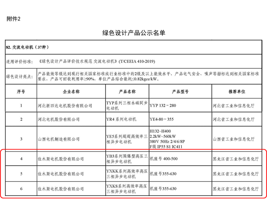2021年12月, 3個(gè)系列高壓電機(jī)產(chǎn)品獲得國家“綠色設(shè)計(jì)產(chǎn)品”稱號,IE5系列電機(jī)機(jī)企業(yè)產(chǎn)品標(biāo)準(zhǔn)獲得國家企業(yè)標(biāo)準(zhǔn)“領(lǐng)跑者”稱號,該標(biāo)準(zhǔn)中規(guī)定的效率是目前國內(nèi)最高效節(jié)能隔爆型異步電動(dòng)機(jī)產(chǎn)品,效率值超過最新的國家能效標(biāo)準(zhǔn)1級指標(biāo)要求。受此認(rèn)證,佳電股份將被納入萬家用能單位的采購?fù)扑]名單,作為綠色電動(dòng)機(jī)產(chǎn)品被鼓勵(lì)優(yōu)先采購。