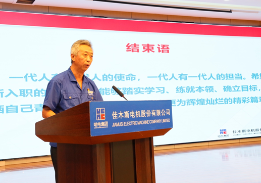 劉清勇講述了公司的發(fā)展歷程、未來戰(zhàn)略方向及對青年人才的殷切希望。他指出,公司作為上市公司,特種電機的龍頭企業(yè),電機行業(yè)的領(lǐng)航者,公司的平臺是足夠廣闊的,會給每個有追求的人搭建實現(xiàn)人生價值的舞臺。劉清勇寄語新入職大學生,“一代人有一代人的使命,一代人有一代人的擔當。希望新入職的大學生,能夠踏實學習、練就本領(lǐng)、確立目標,揮灑自己青春的汗水,去書寫佳電更為輝煌燦爛的精彩篇章”。