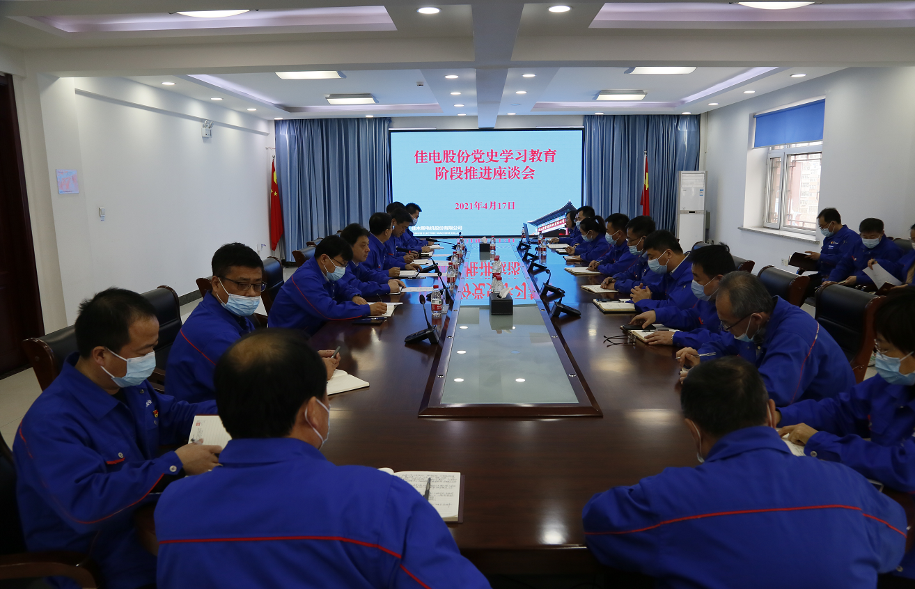 為進(jìn)一步落實(shí)習(xí)近平總書記在黨史學(xué)習(xí)教育動(dòng)員大會(huì)上的重要講話精神,貫徹集團(tuán)公司黨委黨史學(xué)習(xí)教育各項(xiàng)具體部署要求,4月17日,佳電股份黨委召開黨史學(xué)習(xí)教育推進(jìn)座談會(huì)。公司黨史學(xué)習(xí)教育領(lǐng)導(dǎo)小組組長、黨委書記、董事長劉清勇主持會(huì)議并講話。公司黨史學(xué)習(xí)教育領(lǐng)導(dǎo)小組副組長、黨委副書記劉漢成做黨史學(xué)習(xí)教育階段總結(jié)并就下一步工作進(jìn)行安排。公司黨史學(xué)習(xí)教育領(lǐng)導(dǎo)小組成員、公司黨史學(xué)習(xí)教育辦公室成員和各基層單位黨政負(fù)責(zé)人參加會(huì)議。