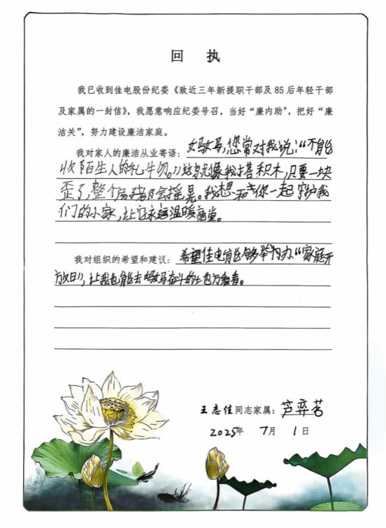 佳電股份將廉潔教育觸角延伸至“家庭”陣地,向近三年新提職干部、85后年輕干部及其家屬同步發(fā)放《家庭助廉倡議書》與《給年輕干部提個(gè)醒》廉潔讀本。倡議書中既有黨紀(jì)法規(guī)解讀,又含溫情寄語(yǔ),旨在以家庭“小港灣”筑牢企業(yè)“大防線”?;顒?dòng)中,黨員干部與家屬共同研讀、深刻感悟,家屬們紛紛回信,字里行間滿是“廉潔齊家”的囑托與“慎終如始”的期許,讓清廉家風(fēng)在企業(yè)中傳遞。
