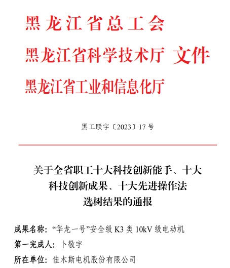 近日,黑龍江省總工會(huì)、省科學(xué)技術(shù)廳、省工業(yè)和信息化廳發(fā)布了全省職工“十大科技創(chuàng)新能手、十大科技創(chuàng)新成果、十大先進(jìn)操作法”選樹名單,哈爾濱電氣集團(tuán)佳木斯電機(jī)股份有限公司(以下簡(jiǎn)稱“佳電股份”)《“華龍一號(hào)”...